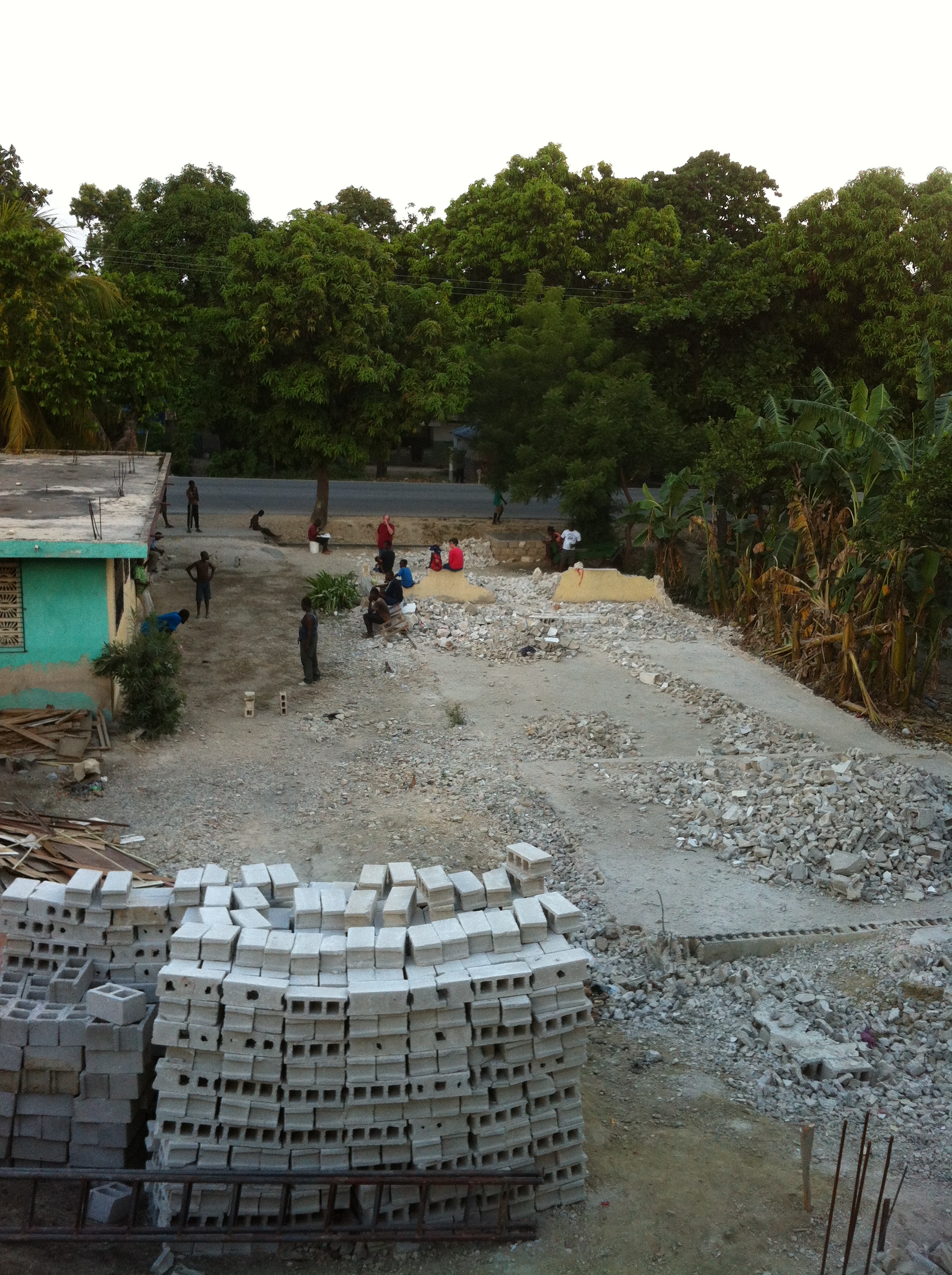 Today we began moving concrete, lots and lots of concrete. The pile closest to the school needs to be replied into the confines set forth by our esteemed project engineer. All of the remaining concrete block covering the church slab needs to be shuttled onto a new site out front.  Making matters worse new cinder block arrived yesterday and half our crew has started working on a new wall surrounding the church.  Half the manpower twice the work and it appears today will be the hottest yet.  Time to buckle down and get to it.