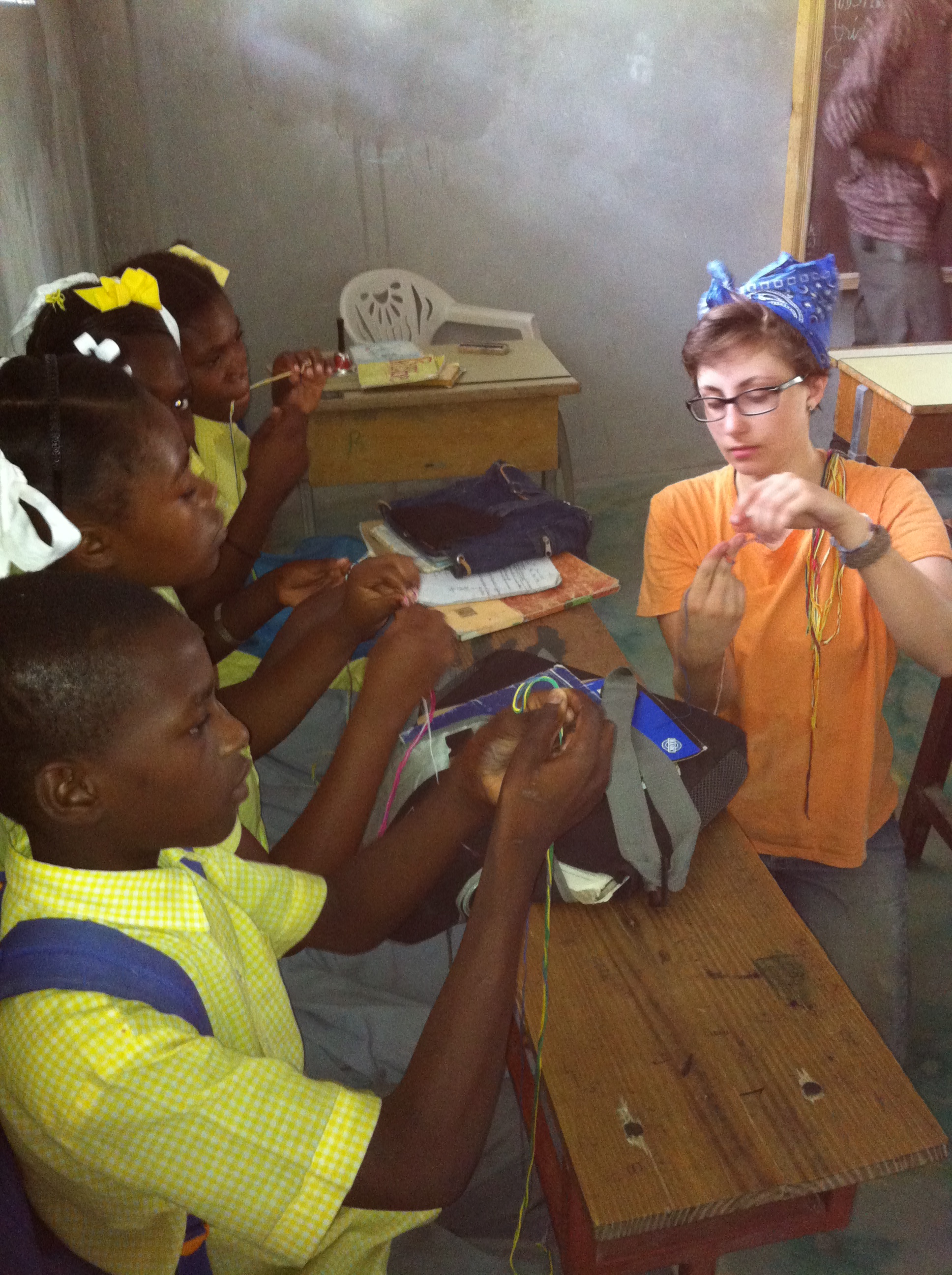Entering the classroom it was clear everyone was having a fantastic time.  All of the children were in the throes of making bracelets from string.  Each one of our group was spread around helping children with their projects! One little boy sitting at the table in front of me tapped me on the shoulder showing what an impressive job he had done with his project.  All of them smiled, laughed and generally appeared to be taking the bracelet project quite seriously.  Cody started out quiet as usual but after having Maggie drag him around a few times he started talking with the kids. It was good for him. The boys seem to look up to him and were always confused by his quiet demeanor.