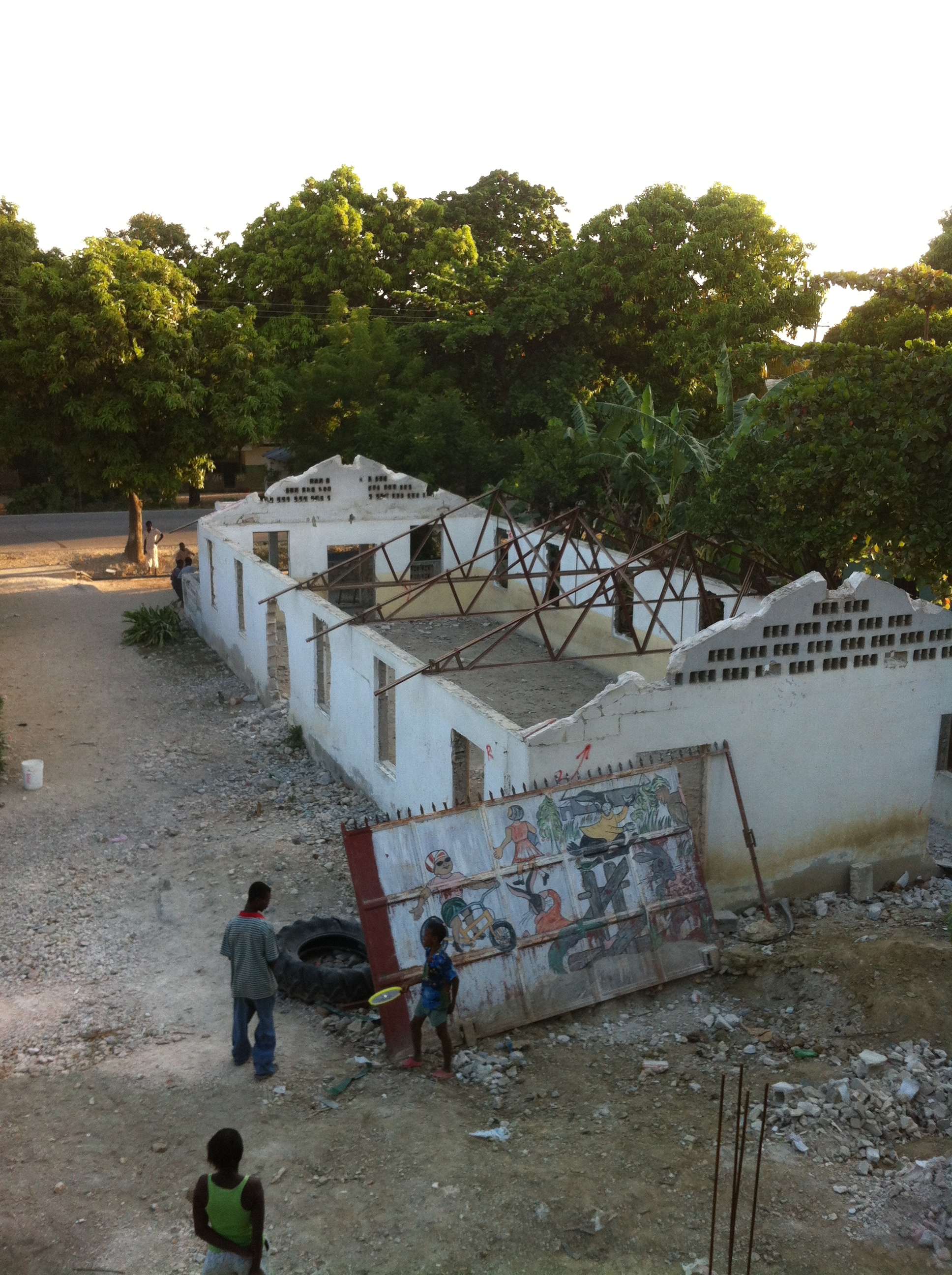 The day was long and hard, but we completed our goal! My estimate would be approximately 25-30 tons of debris moved by hand! The floor was clean for the kids and we all were excited, having accomplished our goal! It also appears there will be a party given in our honor by the community tonight. The community leaders have decided to hold it  right upon the very floor we just cleared! Some teenage kids along with a few adults cleaned it off with buckets of water and brooms made from palm leaves while we all bathed. Speaking of bathing, my last bath was the best bath ever! The water was cool, the warm breeze felt fantastic and I finally took my work shorts off for the last time! These shorts became sort of a running gag, as we started on Friday, they were covered with a thick layer of dirt from the ceiling.  So dirty they were that I puffed my chest out and with a smart ass tone declared them the official work shorts of Haiti! Then boldly declaring they shall be worn everyday until we finish our mission! Of course my little quip was merely to gross out our group and yet they women from cell block C would not let me forget that asinine statement.  So following through with my word, the shorts were worn everyday until Thursday at 4:30 when they hit the bathing room floor for the very last time!  Yes they smelled bad, they had changed color and they practically stood up on their own, but success was mine!