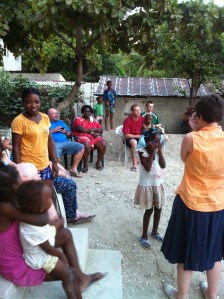 Chairs and church pews are being brought out then placed in a semi-circle on the slab.  A boom box has arrived, lights have been strung up and our generator is at full throttle.  People from all over the neighborhood are arriving and we have been asked to be seated.  Once again Charles says some very kind words in regards to our hard work and dedication.  He leads us all in a prayer and blesses the evenings upcoming activities.  Soon we are entrenched in song, laughter and some of the funniest skits! Its like summer camp with musical chairs and impromptu performances! We are all having the time of our lives! The children sing for us, its beautiful, a young woman sings for us and doesn’t miss a beat when the CD stops playing.  Then a well dressed young man holding a guitar stands up to sing a song to our group but instead turns and sings directly to our Anne!  It was hilarious!  Some of us were pretty sure afterwords an arranged Haitian marriage had just taken place and Anne was “gonna have some splaining to do” when she arrived home with the new hubby!  Earlier in the evening this young man mustered up the courage to give Anne a wonderfully written love letter filled with devotion to her very existence! So we just knew through Haitian song they were now husband and wife!
