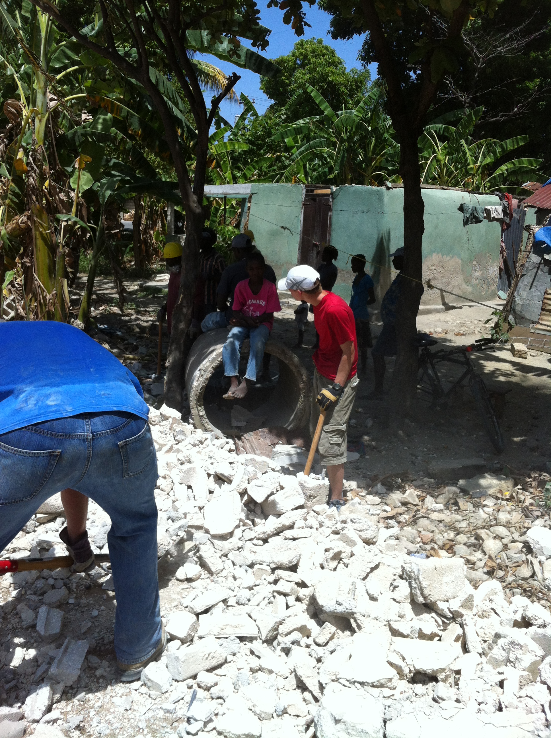 There was a moment today when through sweat and exhaustion I sat upon a broken piece of concrete. Placing my sledgehammer on the ground, pulling down my sock to rub my very swollen ankle I looked up past the brim of my hat to see Cody still swinging a sledge without falter. He had been going nonstop, breaking one brick after another, working alongside the Haitians without fail. I stared at him through the eyes of a father, for he appeared to be no longer a boy. He stood there not a small child to be protected but a young man with strength and determination. He was becoming a man, and pride filled my chest as tears streamed from my eyes. There were no words to say what needed or didn’t need to be said, just me staring at him crying my eyes out like a little baby. I think it was Heather who asked me if I was ok to which I replied in a smart tone “I got something in my eye” while rubbing my face! She just laughed, and after I explained my emotions it only strengthened what she already knew. I loved my son and was filled with joy.
