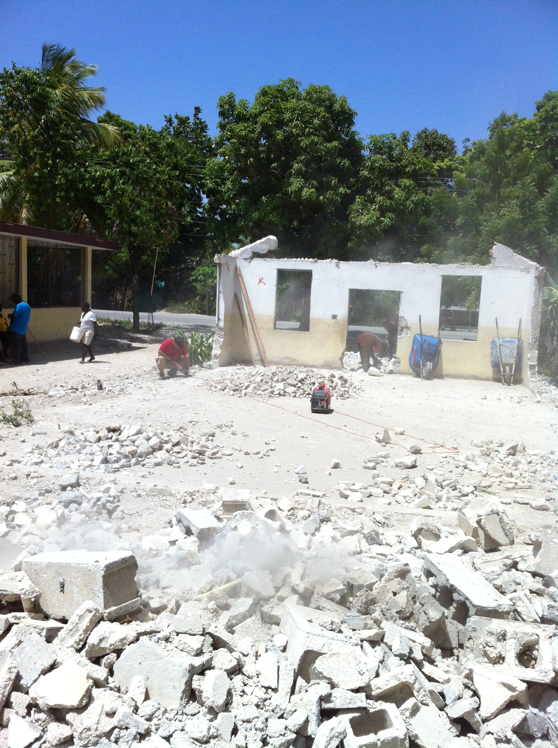 That’s the way today went down. Everyone started out timid, focused, but after removing then dismantling the last three trusses it was Hammer Time! Four walls made of cinder block, 10 Americans, 5 Haitian workers and two interpreters all ready knock them down! John C and John G (affectionately nick named Hammer Time) started breaking block over the windows so we could cut re-bar ties. By doing this we could then knock a break line at window height and with ropes in place pull the wall away from the striker slowly bringing the walls down one window section at a time. Taking down walls in this fashion also expedited our clean up time with the blocks being broken up, swept up and moved to a debris pile outside, all from the concrete floor of the building.